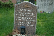 | 26. nov. 2016 kl. 19:37 | Einar Trygve Karlsen gravminne Drøbak kirkegård.jpg (fil) | 194 KB | Bildet viser gravminnet til ekteparet Einar Trygve Karlsen (1896–1970) og Maren Sofie Karlsen (1892–1980) og deres sønn Erik Lindø Karlsen (1920–2006. Lokalitet: Drøbak kirkegård. Fotograf: Nils Eirik Jevne. Bildet er lastet ned... | 1 | |