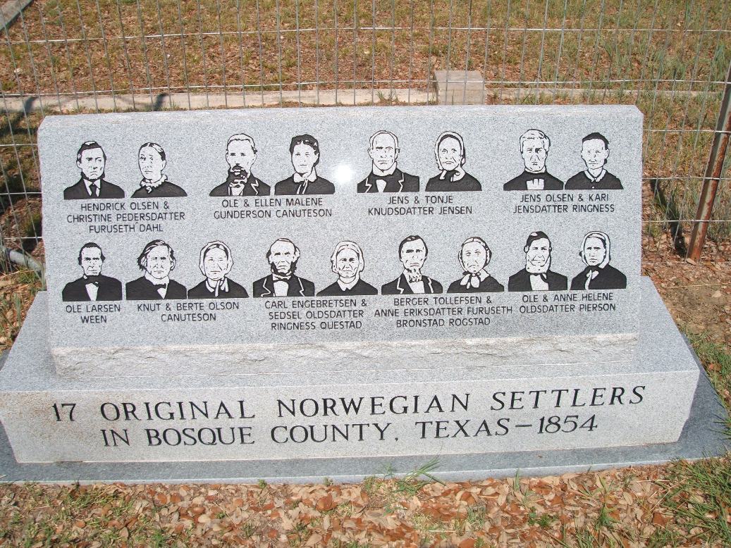 Minnesten over de første nordmennene som slo seg ned i Bosque County. Minnestenen står utenfor Our Saviour's Lutheran Cemetery i Clifton, Texas.