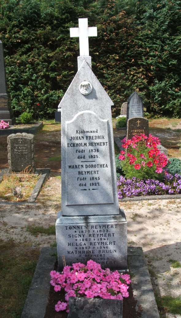 Gravminnet til kjøpmann Johan Fredrik Eckholm Reymert (1836–1925), Maren Dorotha Reymert (1845–1927), Tønnes Reymert (1870–1933), Signy Reymert (1867–1941), Helga Reymert (1882–1946), Kathrine Bruun, f. Reymert (1875–1959) og Thora Reymert (1883–1968), Mandal kirkegård, Mandal i dagens Lindesnes kommune.