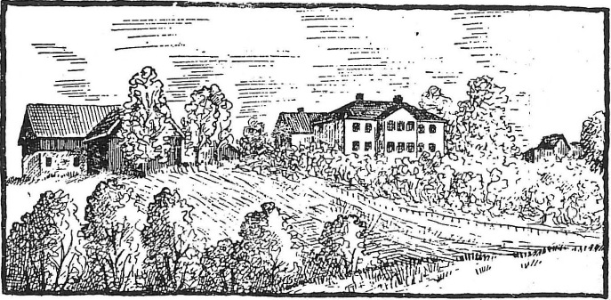 Tegning av Skjerven gård i Lardal. Kilde: Mogens Bugge: Schjerven i Lardal.