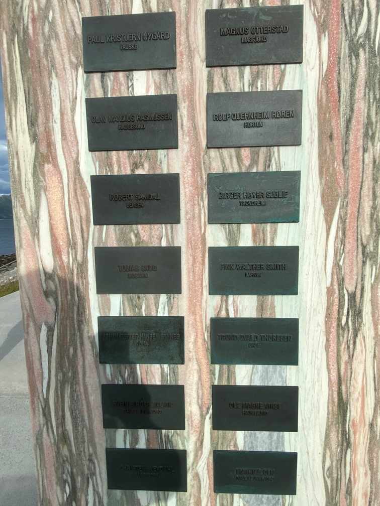 Navneplater på venstre side av Ureddmonumentet, Gildeskål kommune, Nordland.