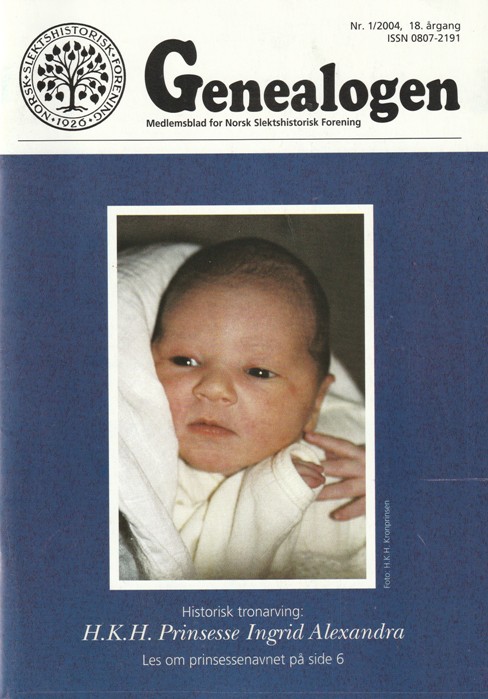 | 29. mai 2023 kl. 20:02 | Genealogen200401.jpg (fil) | 90 KB | Omslaget til ''Genealogen'' nr. 1, 2004. Omslaget viser bilde av prinsesse Ingrid Alexandra. Foto: HKH Kronprinsen/Det kongelige hoff. Kategori:Omslagsbilder av Genealogen | 1 | |