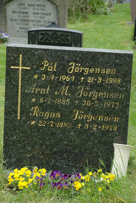 | 26. nov. 2016 kl. 20:15 | Arnt Ragna Jørgensen gravminne Drøbak kirkegård.jpg (fil) | 181 KB | Bildet viser gravminnet til ekteparet Arnt M. Jørgensen (1885–1973) og Ragna Jørgensen (1893–1970), samt Pål Jørgensen (1964–1998. Lokalitet: Drøbak kirkegård. Fotograf: Nils Eirik Jevne. Bildet er lastet ned 26. november 2016... | 1 | |
