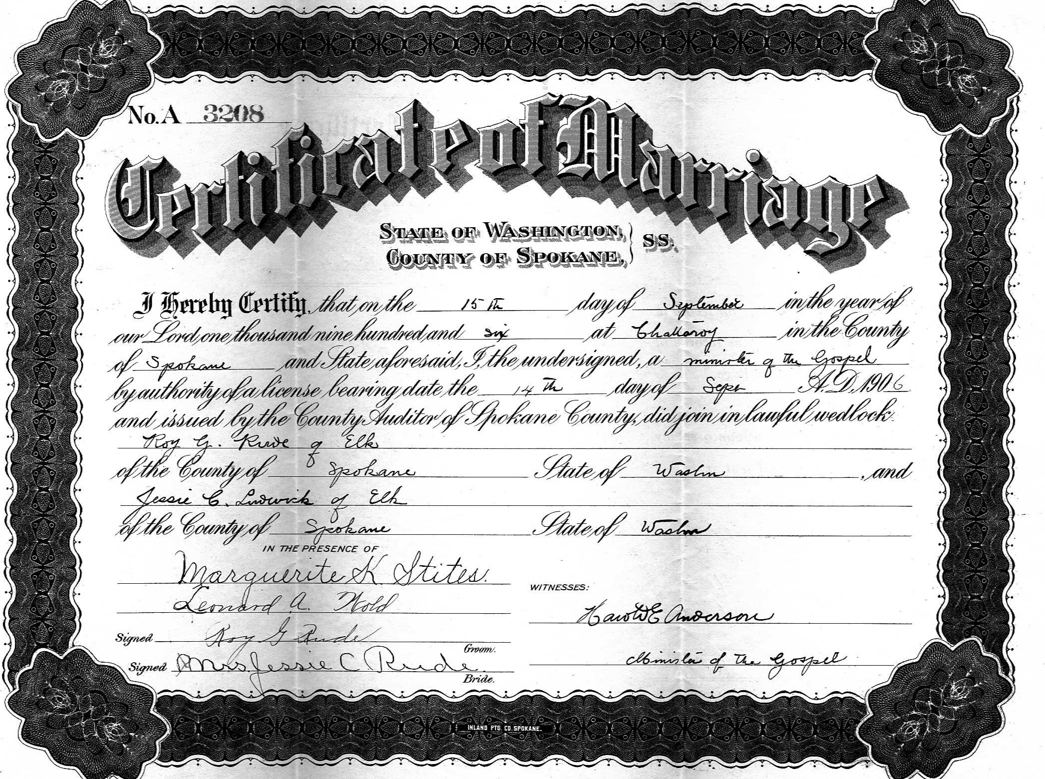| 13. jul. 2017 kl. 14:33 | Rude Roy G Cerificate of Marriage.jpg (fil) | 1,45 MB | Vielsesattest eller ''Cerificate of Marriage'' fra 1905 for Royce Goodwin Rude og Jessie C. Ludwick. Elk, Spokane County, Washington, USA. Dokumentet ble lastet ned av Espen Tjernshaugen den 12. juli 2017 fra [https://www.digitalarchives.wa.gov/Home W... | 1 | |