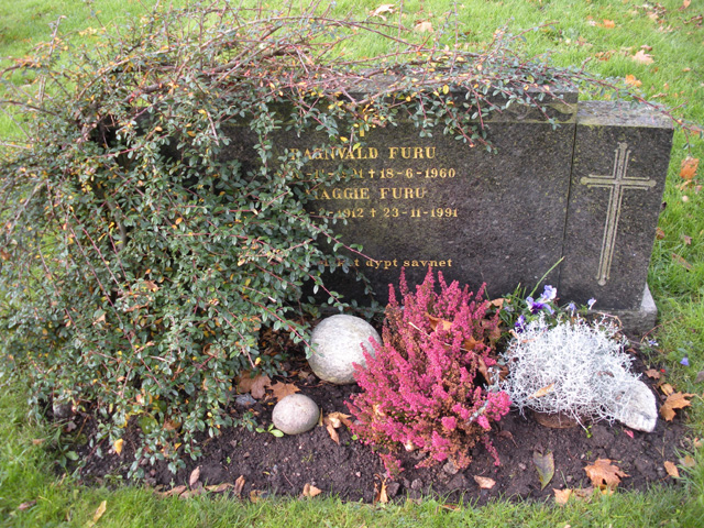 | 15. feb. 2018 kl. 21:33 | Ragnvald Furu gravminne Frogn kirkegaard.jpg (fil) | 257 KB | Bildet viser gravminnet til ekteparet Klaus Ragnvald Furu (1901–1960) og Maggie Bertha Furu (1912–1991). Lokalitet: Frogn kirkegård. Fotograf: Mai Berggren. Bildet er lastet ned 15. februar 2018 fra [http://www.disnorge.no/gravminner/in… | 1 | |