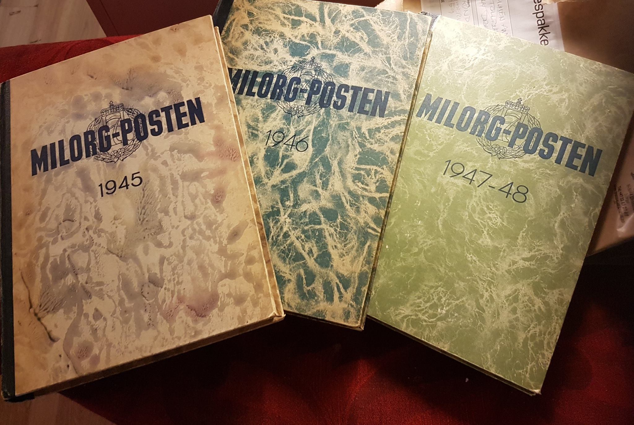 Innbundne eksemplarer av Milorg-Posten i tre bind – 1945, 1946 og 1947–1948.