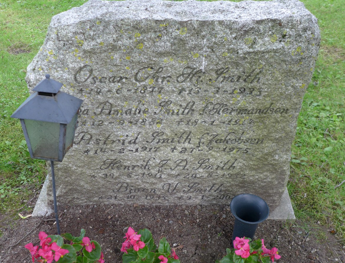 Gravminnet til Oscar Smith (1877–1933), Helga Astrid Smith, f. Hermansen (1917–1975) og Henrik Johan August Smith (1911–1982). Nordre gravlund, Oslo, gravnr. 22.012.12.014.