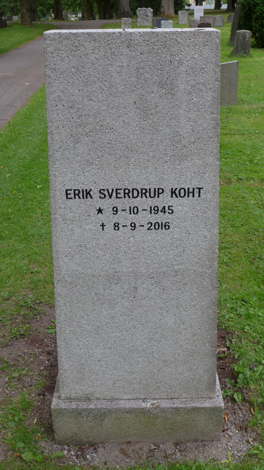 Gravminnet til Erik Sverdrup Koht (1945–2016), Nordre gravlund, Oslo, gravnr. 22.030.11.022. Navnene på andre familiemedlemmer står på [[Halvdan Koht familiegrav Nordre gravlund Oslo.JPG|forsiden] av gravminnet. Erik var yngste sønn av Paul Gruda Koht (1913–2002) og Grete Sverdrup Koht (1913–2002).