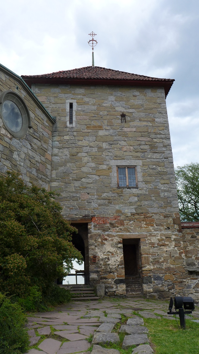 Jomfrutårnet, Akershus slott, med kong Haakon VIIs monogram, fordi restaureringen fant sted under hans regjeringstid. Til venstre Det kongelige mausoleum, Akershus slott, fra utsiden.