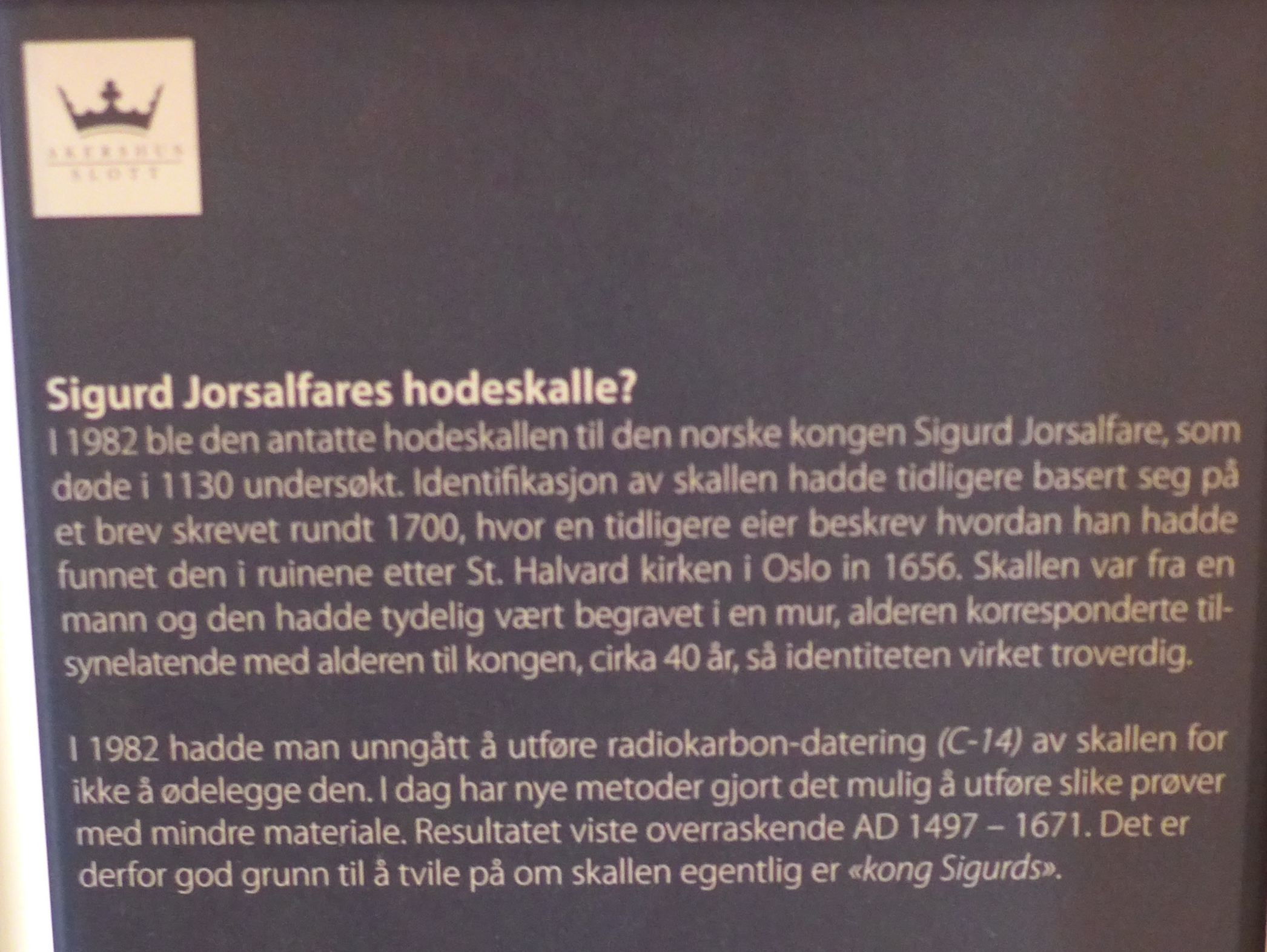 Inormasjonsplakat tilknyttet gravminnet til det som opprinnelig var antatt å være levningene etter kong Sigurd Jorsalfare i Krypten under Akershus slottskirke.