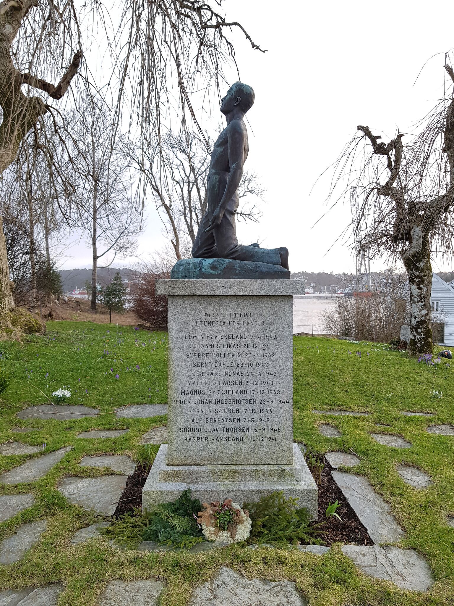 Minnesmerke over falne i striden 1940-45 utan for Stord kyrkje. Minnesmerket heidrar 12 falne.