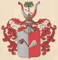 Slektsvåpenet kan heraldisk beskrives (blasoneres) slik: Skjold kløvd av sølv og rødt; over kløvningen i motsatte tinkturer en traneklo holdende en svart kule. På hjelmen en sølv due holdende et grønt oljeblad i nebbet stående under et grønt laurbærtre mellom to vesselhorn vekselvis delt i rødt og sølv.[2]