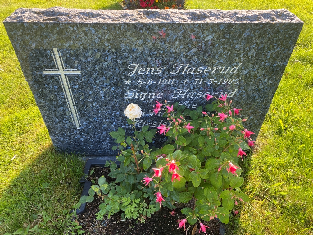 | nåværende | 25. aug. 2021 kl. 09:13 | 1 008 × 756 (978 KB) | Dag T. Hoelseth (diskusjon | bidrag) | Gravminnet til Signe Aaserud, f. Lie (1916–2001), Jens Aaserud (1911–1985) og datteren Kirsten Realini (1945–2009), Ullern kirkegård, Sør-Odal. Kirstens navn er godt gjemt bak blomstene. Signe var stedatter til Magnus Sødem.… |