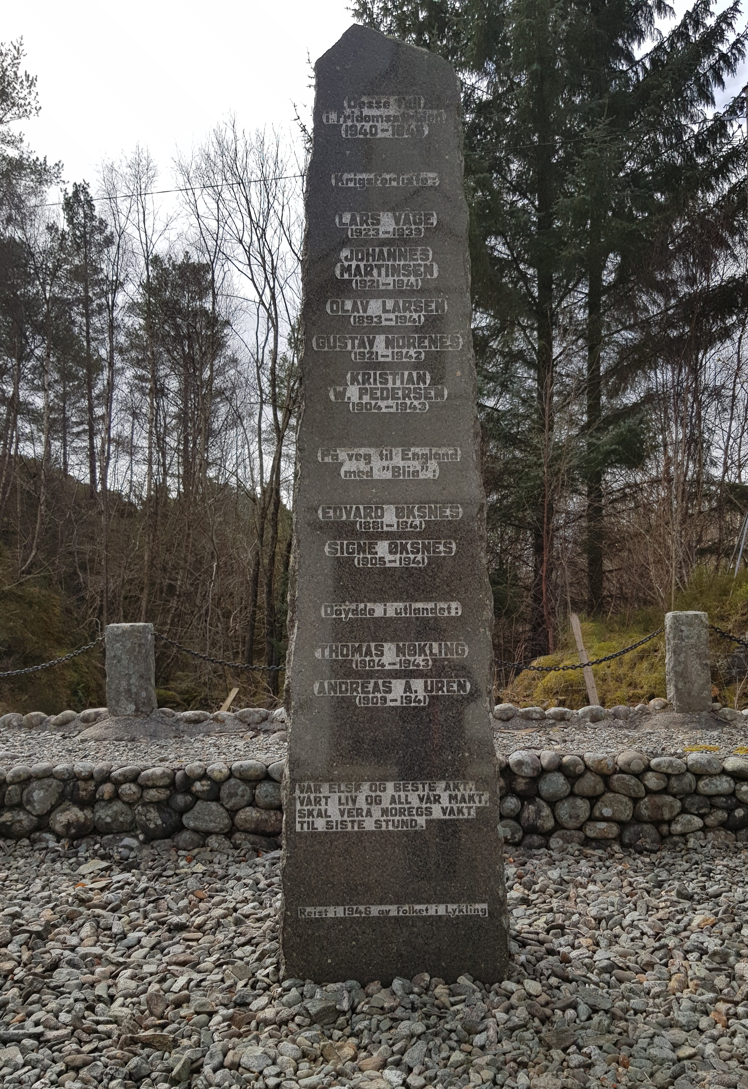 Minnesmerke over falne i striden 1940-45 utan for Lykling kyrkje. Minnesmerket heidrar 9 falne.