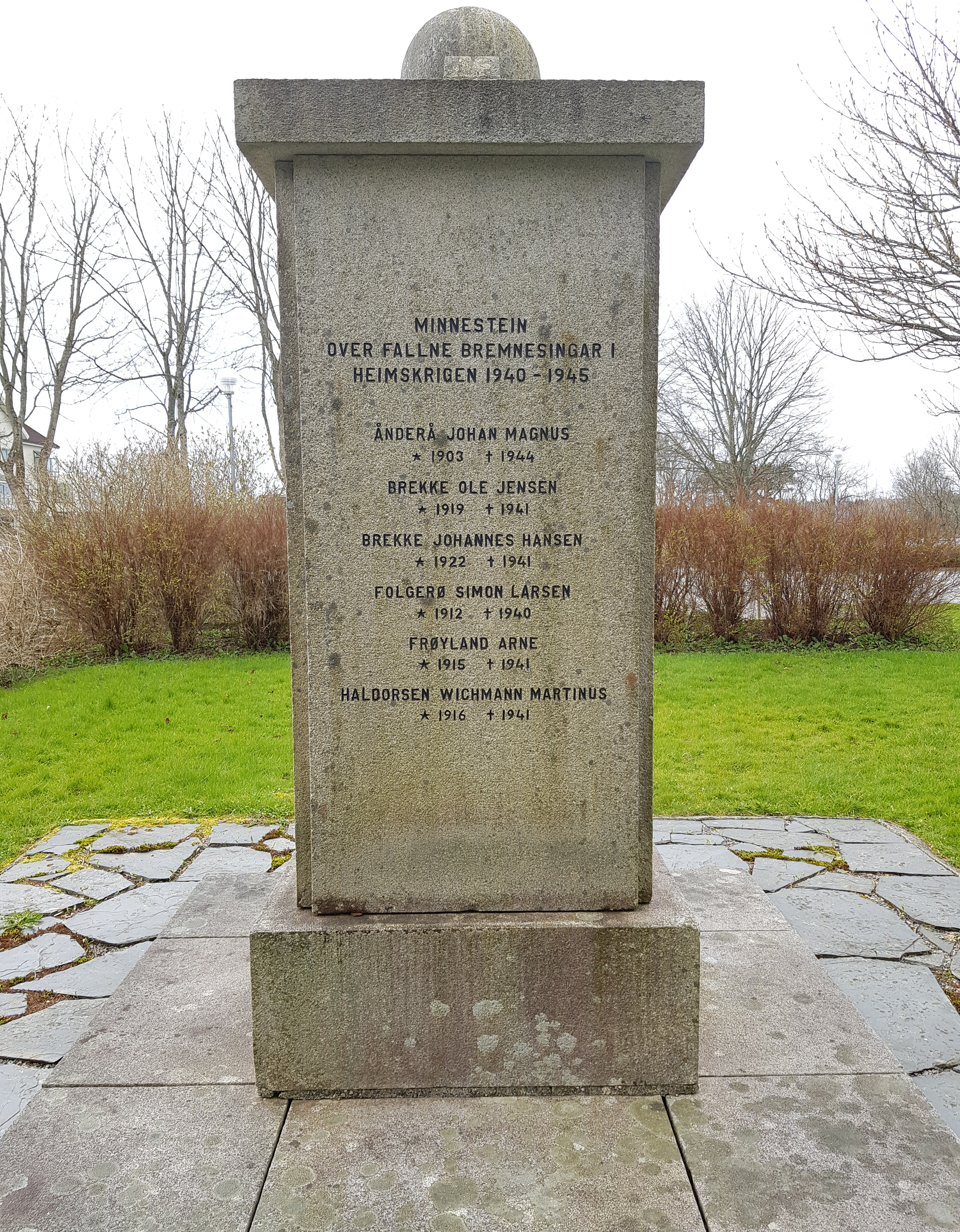 Minnesmerke over falne i striden 1940-45 utan for Bremnes kyrkje. Minnesmerket heidrar 22 falne.