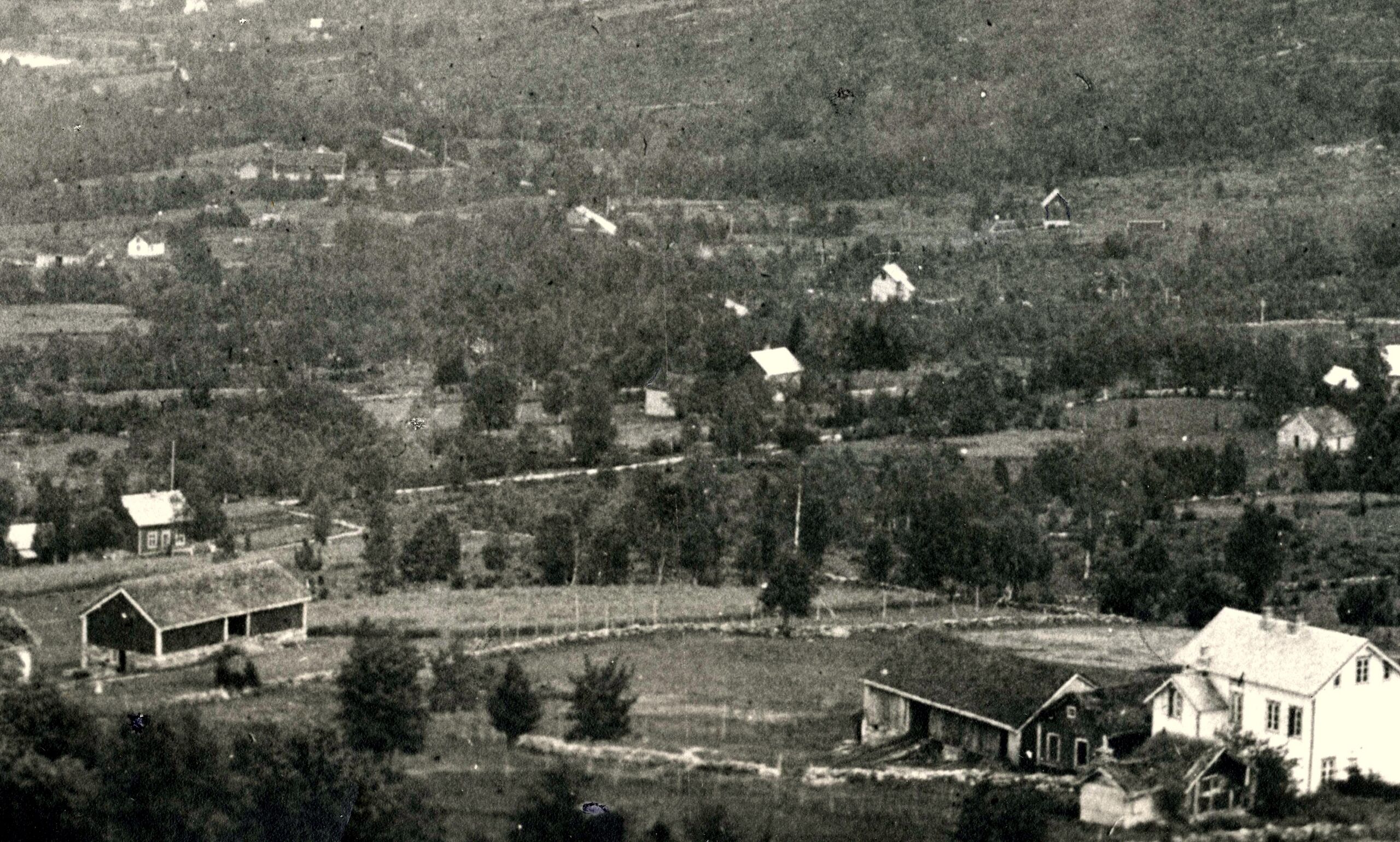Bildet viser til høyre restene av klyngetunet Olagarden(nederst) og Ivargarden(øverst) som i 1908 ble ombygd til Sunnmøre Barneheim. Til venstre vises det nye tunet som Enok Olai Knutson Hovde (1863–1934) bygde, etter at han tok over Olagarden i 1896. Fotograf: Jon Fagerhol, bildet er tatt i 1910.