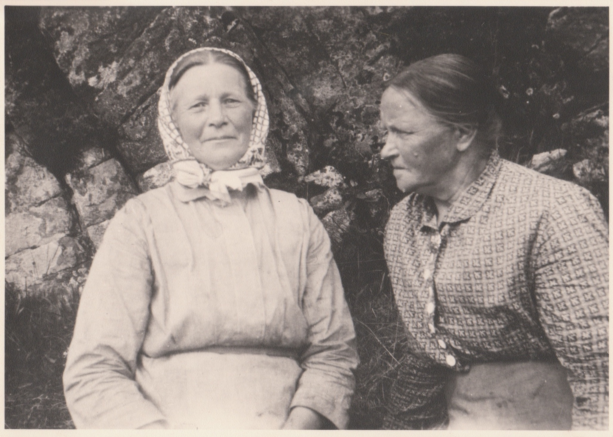 Bildet viser fra venstre søstrene Kirsten Hanssen (1868–1945) Anna Christine Hanssen (1865–1940). De var gift med hver sin bror Mikal Grastvedt (1865–1938) og Johan Bertin Christiansen Grastveit (1853–1946). Fotograf: Ukjent.