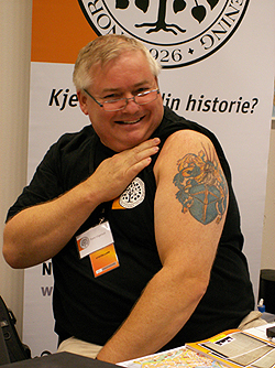 Tore Hermundsson Vigerust viser stolt frem våpentatoveringen sin under en stand for Norsk Slektshistorisk Forening 2009 (?). Fotograf: Are S. Gustavsen.