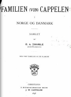 Tittelbladet til slektsboken Familien (von) Cappelen i Norge og Danmark av E.A. Thomle, 1896.